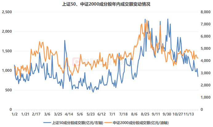 注:上证50、中证2000成分股年内成交额变动情况(截至11月28日收盘)