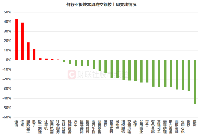 分行业来看,以本周(11月24日至28日)成交额较上周(11月17日至21日)数据统计,31个申万一级板块中,仅有通信、传媒、国防军工、电子、轻工制造、计算机、家用电器、社会服务8个板块本周成交额录得增长,占比近25%,其中,通信、传媒板块热度提升明显。而煤炭、钢铁、石油石化、非银金融热度大降,本周成交额降幅均在30%以上。